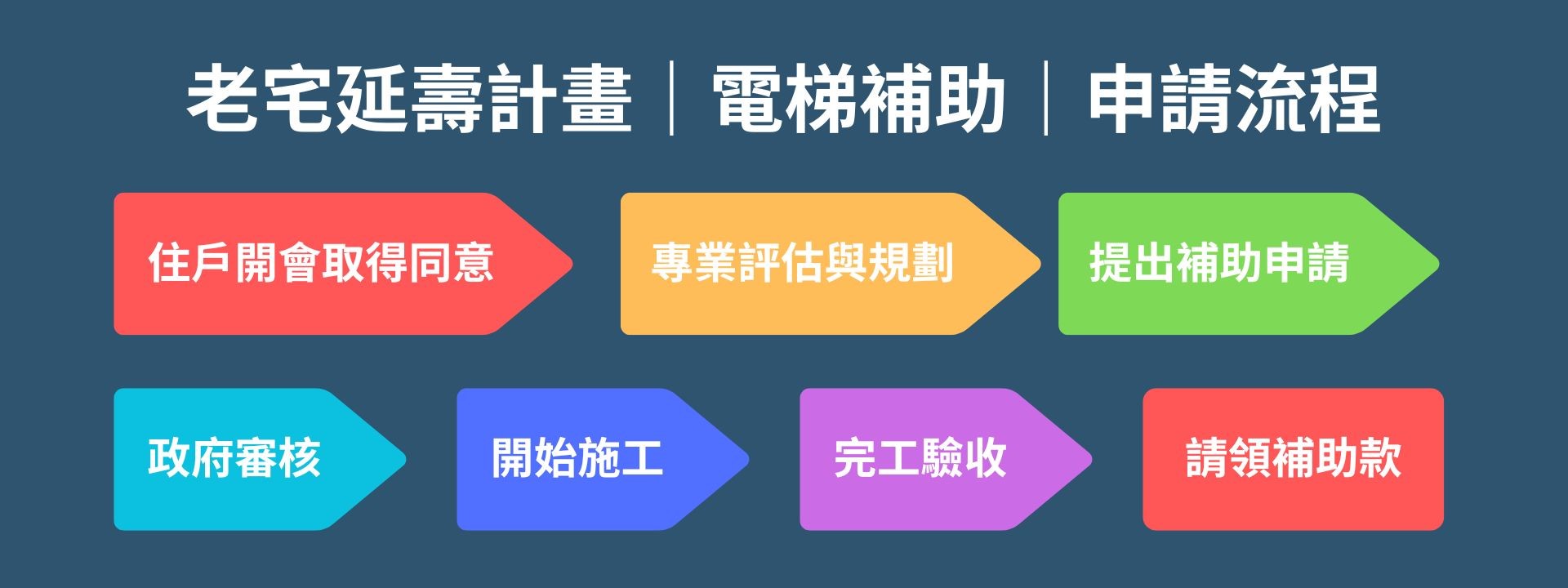 住戶開會取得同意 → 專業評估與規劃 → 提出補助申請 → 政府審核 → 開始施工 → 完工驗收 → 請領補助款